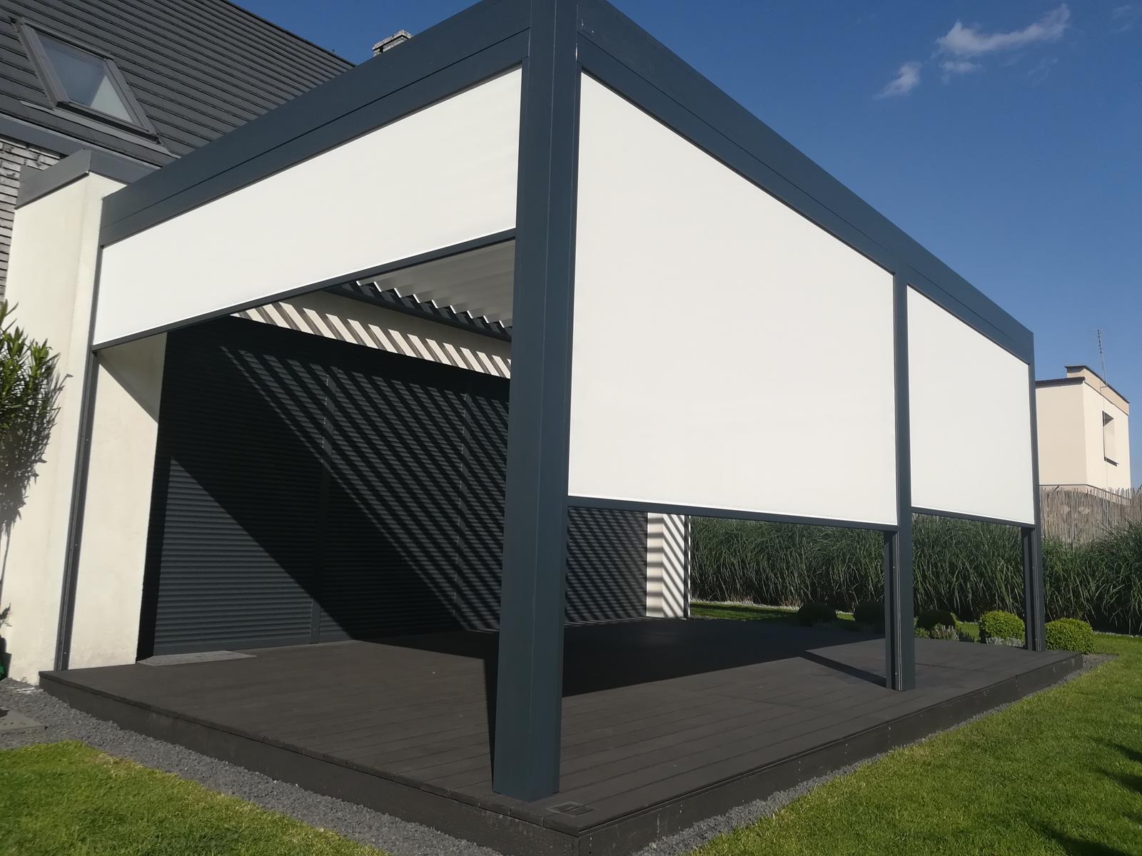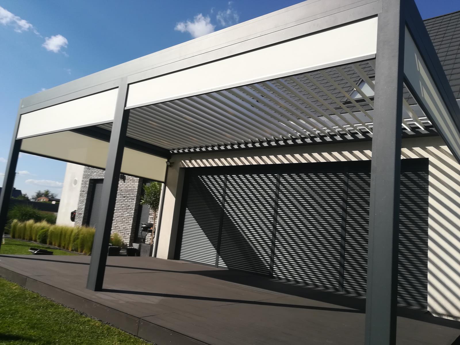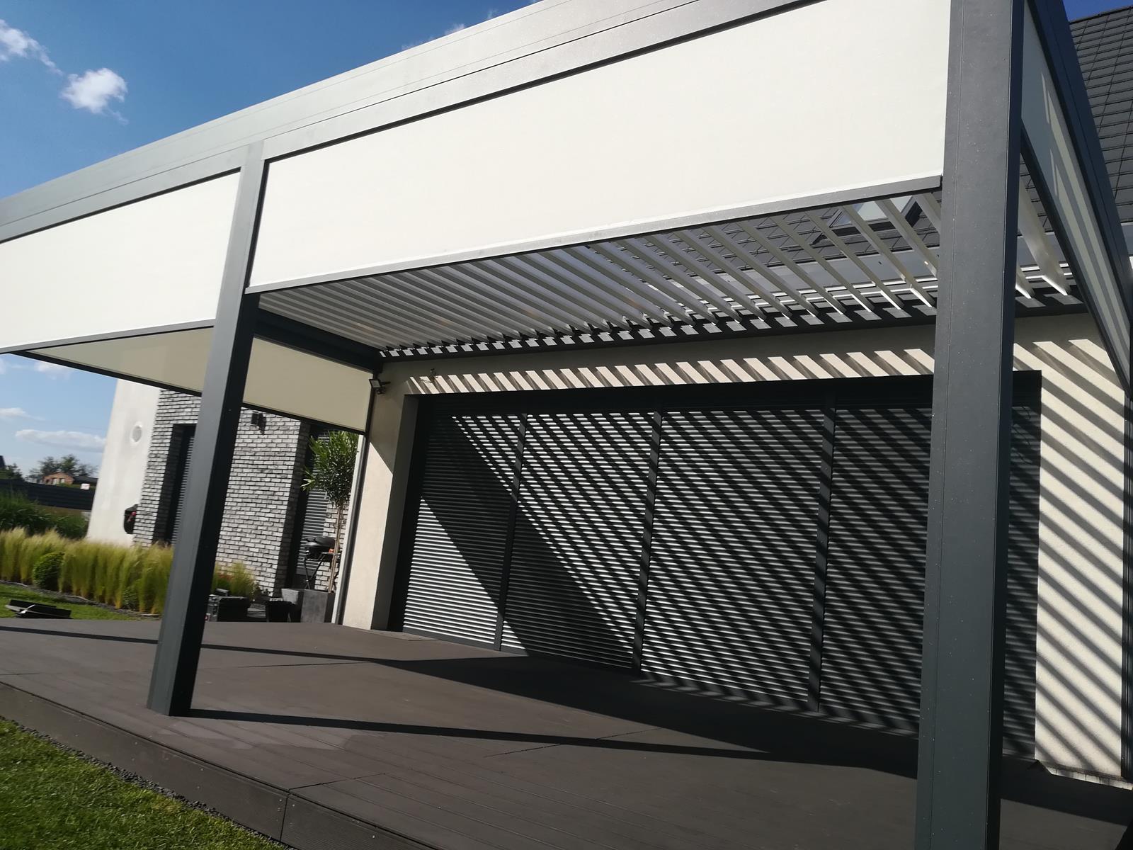 Przed Państwem tegoroczna realizacja - najbardziej praktyczne i funkcjonalne zadaszenie tarasu. Pergola lamelowa - z wbudowanym oświetleniem punktowym w lamelach (możemy płynnie zmieniać natężenie światła) oraz bocznymi screenami. Całość idealnie spasowana w klasycznej nowoczesnej kolorystyce - konstrukcja z nogami w kolorze antracyt RAL 7016 struktura, dach RAL 9010 biały mat, screeny w kolorze białym z jasną tkaniną o przejrzystości 5%. Całość sterowana radiowo za pomocą jednego wspólnego pilota. Połączenie idealne. Kto się z nami zgadza? Zapraszamy do kontaktu z naszą firmą po więcej informacji.