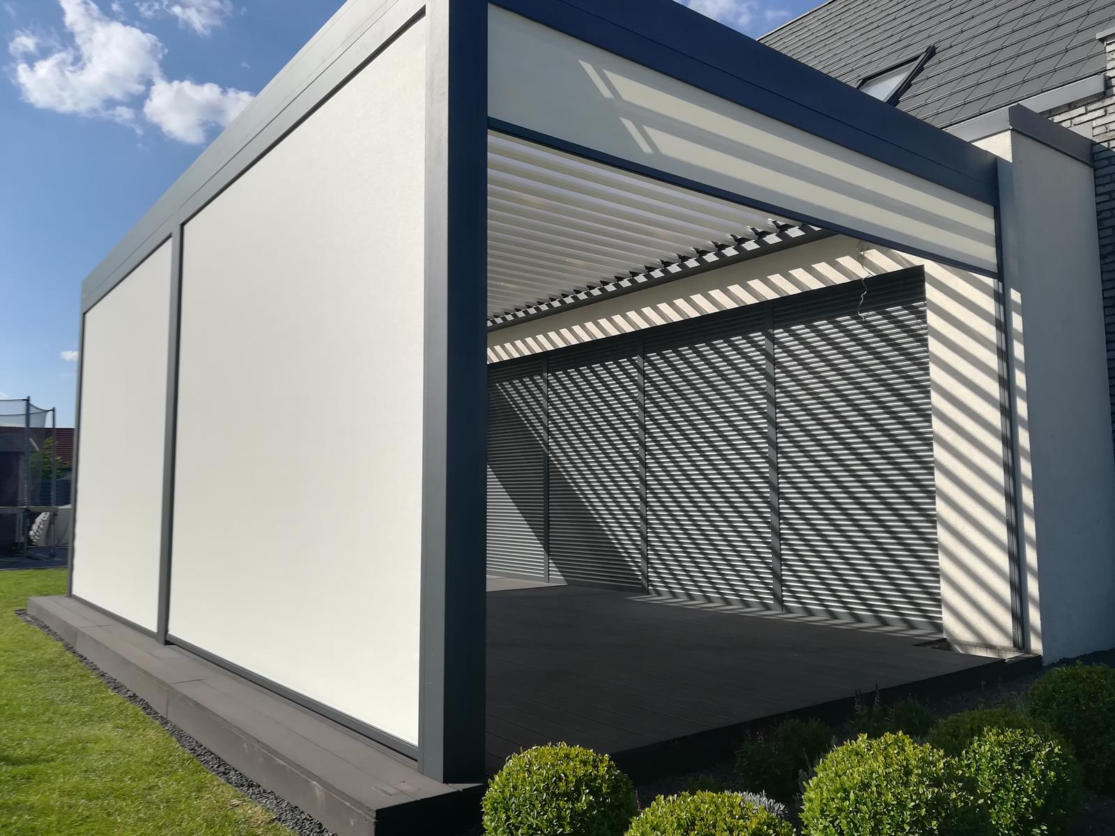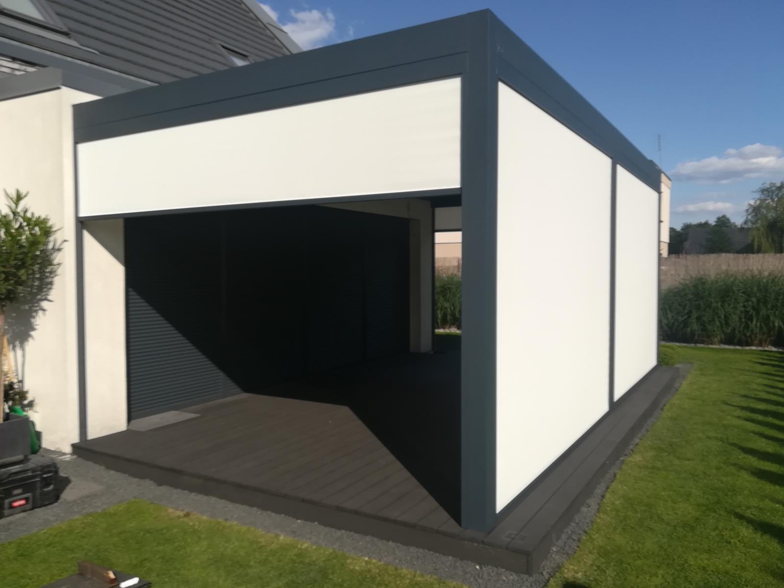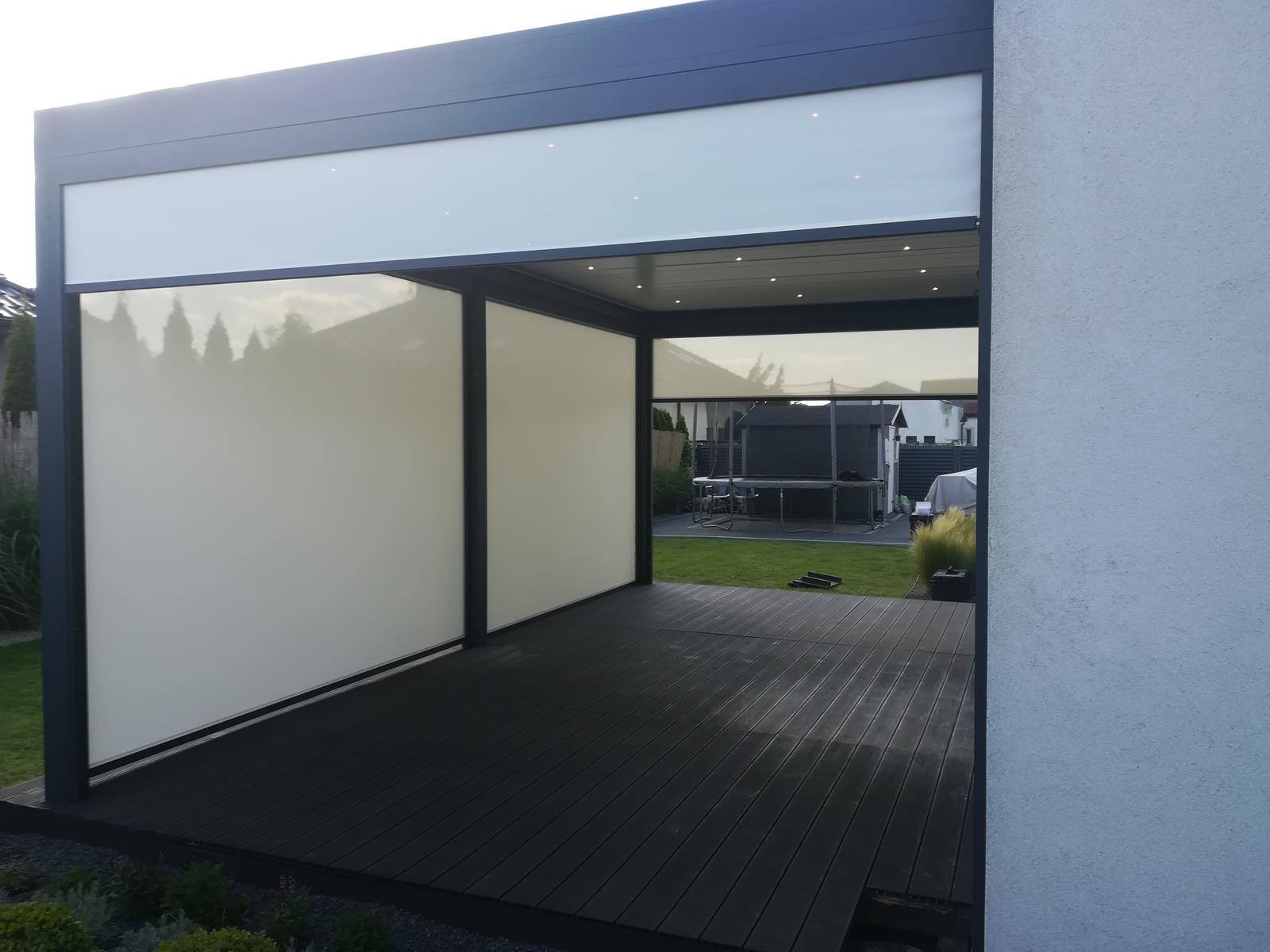 Przed Państwem tegoroczna realizacja - najbardziej praktyczne i funkcjonalne zadaszenie tarasu. Pergola lamelowa - z wbudowanym oświetleniem punktowym w lamelach (możemy płynnie zmieniać natężenie światła) oraz bocznymi screenami. Całość idealnie spasowana w klasycznej nowoczesnej kolorystyce - konstrukcja z nogami w kolorze antracyt RAL 7016 struktura, dach RAL 9010 biały mat, screeny w kolorze białym z jasną tkaniną o przejrzystości 5%. Całość sterowana radiowo za pomocą jednego wspólnego pilota. Połączenie idealne. Kto się z nami zgadza? Zapraszamy do kontaktu z naszą firmą po więcej informacji.