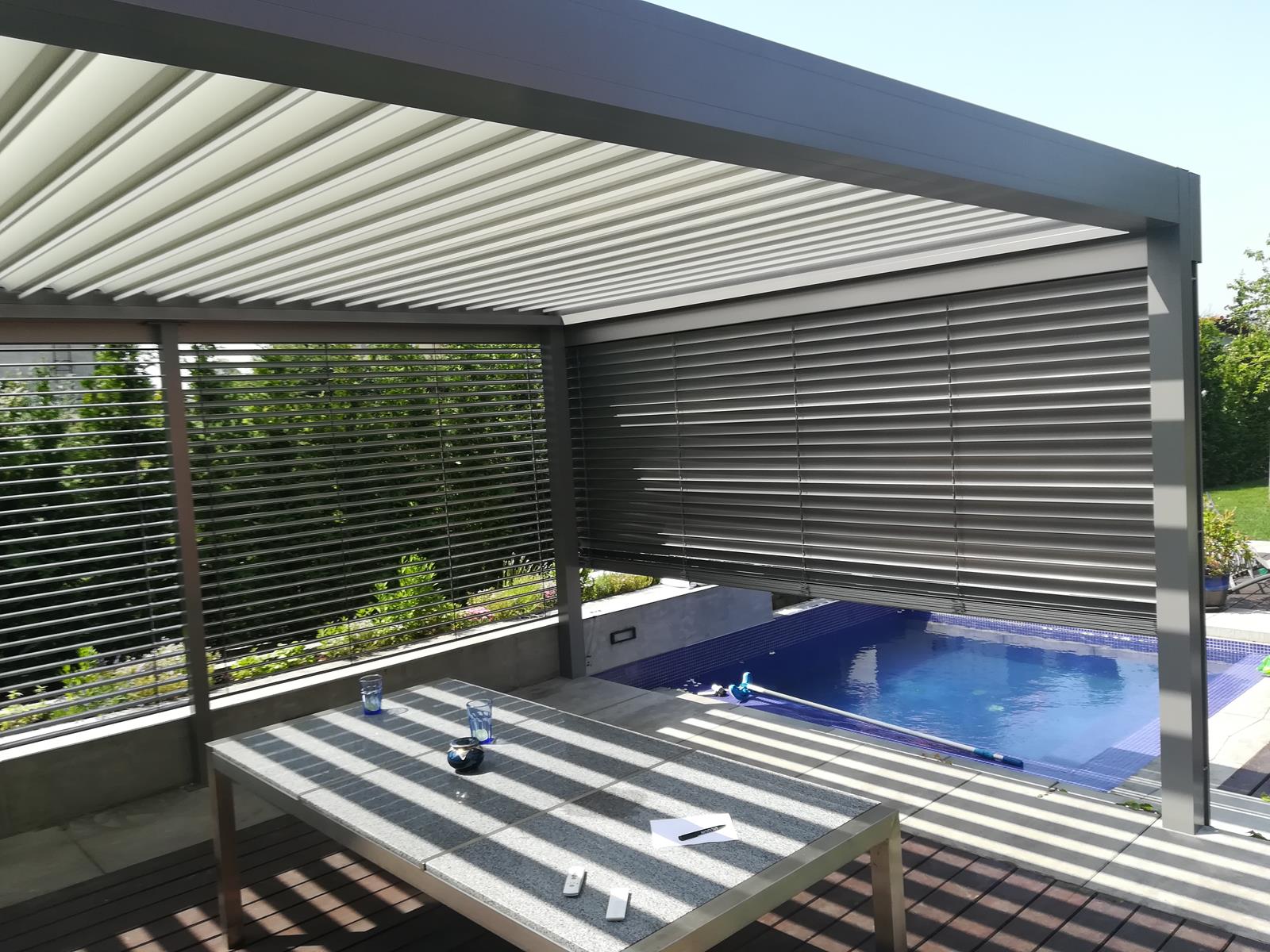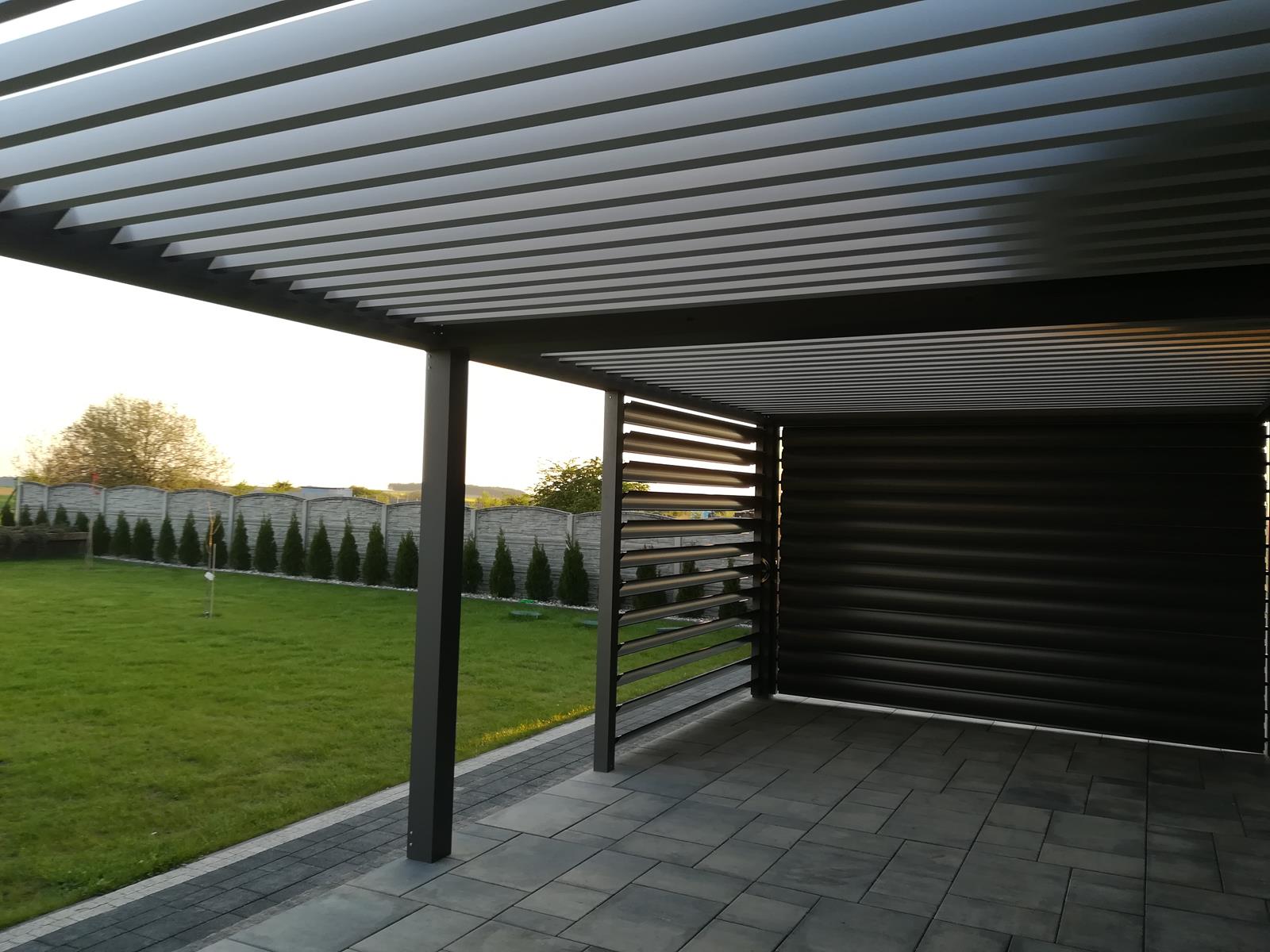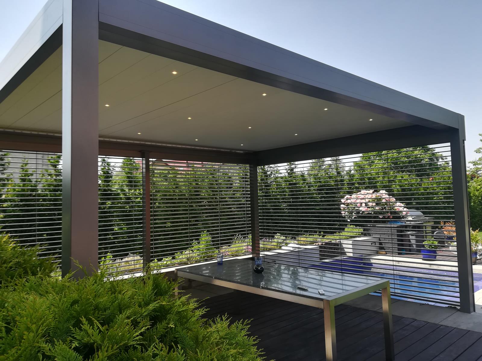 Pergola lamelowa z żaluzjami poziomymi w wyposażeniu