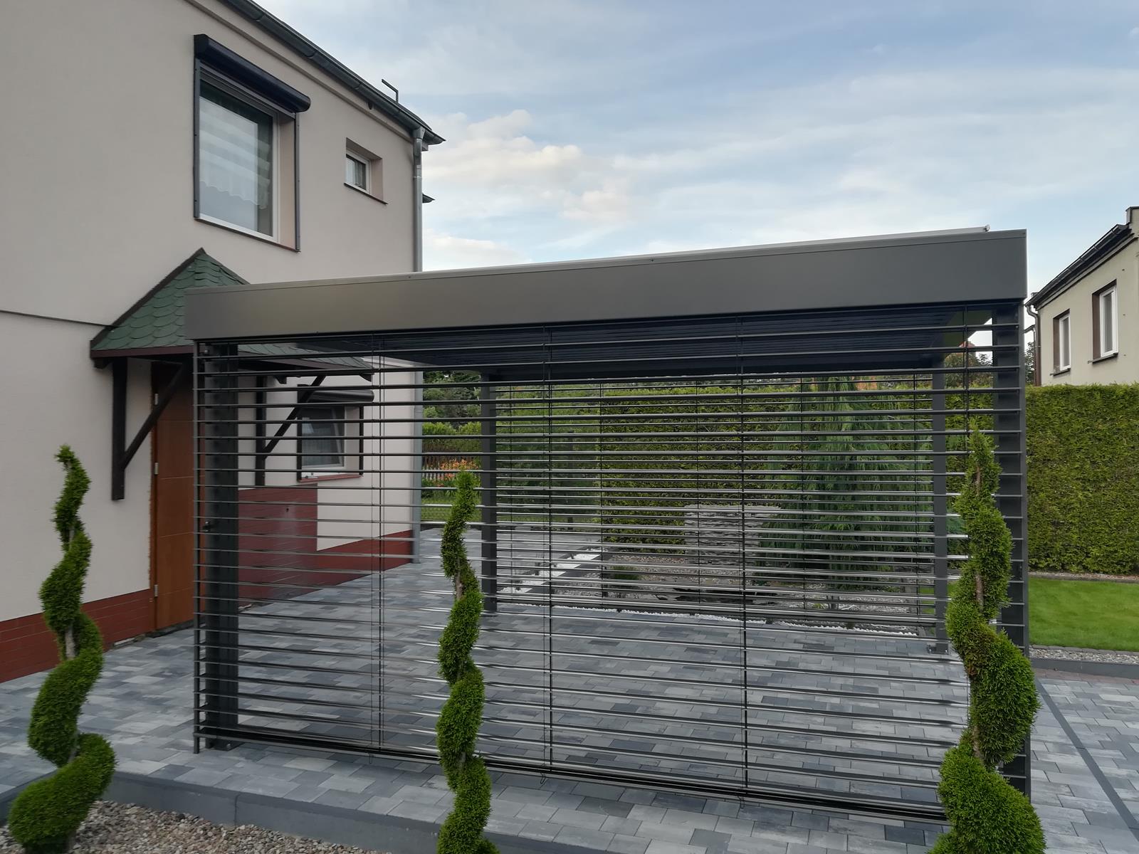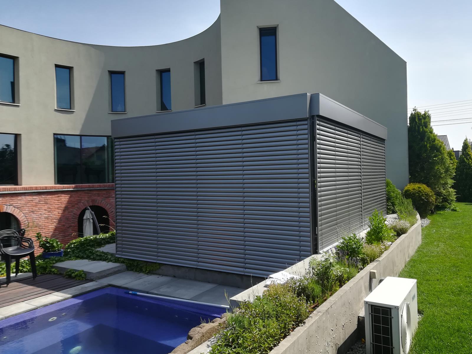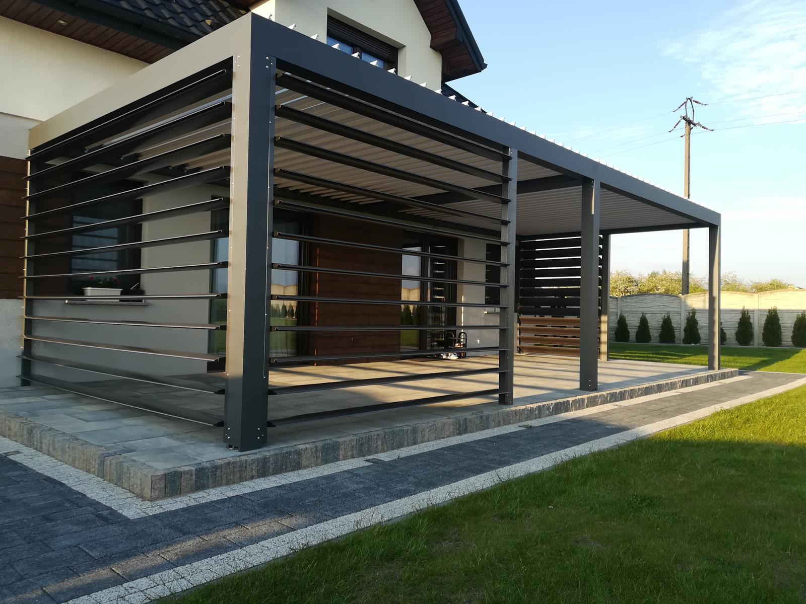 Pergola lamelowa dzięki swojej "kwadratowej" formie i braku pochylenia, jest bardzo "rozwojowa", jeżeli chodzi o zabudowę jej boków. Klasycznie od wielu lat najczęściej Klienci dobierają w opcji rolety pionowe w systemie zip oraz szyby przesuwne bezramowe lub ramowe. Od pewnego czasu jednak coraz częściej dobierane są także boczne osłony w postaci klasycznych żaluzji fasadowych lub poziomych lameli elewacjnych. Połączenie dachu lamelowego z tą samą formą zabudowy bocznej naszym zdaniem wygląda przepięknie i jest bardzo praktyczne.