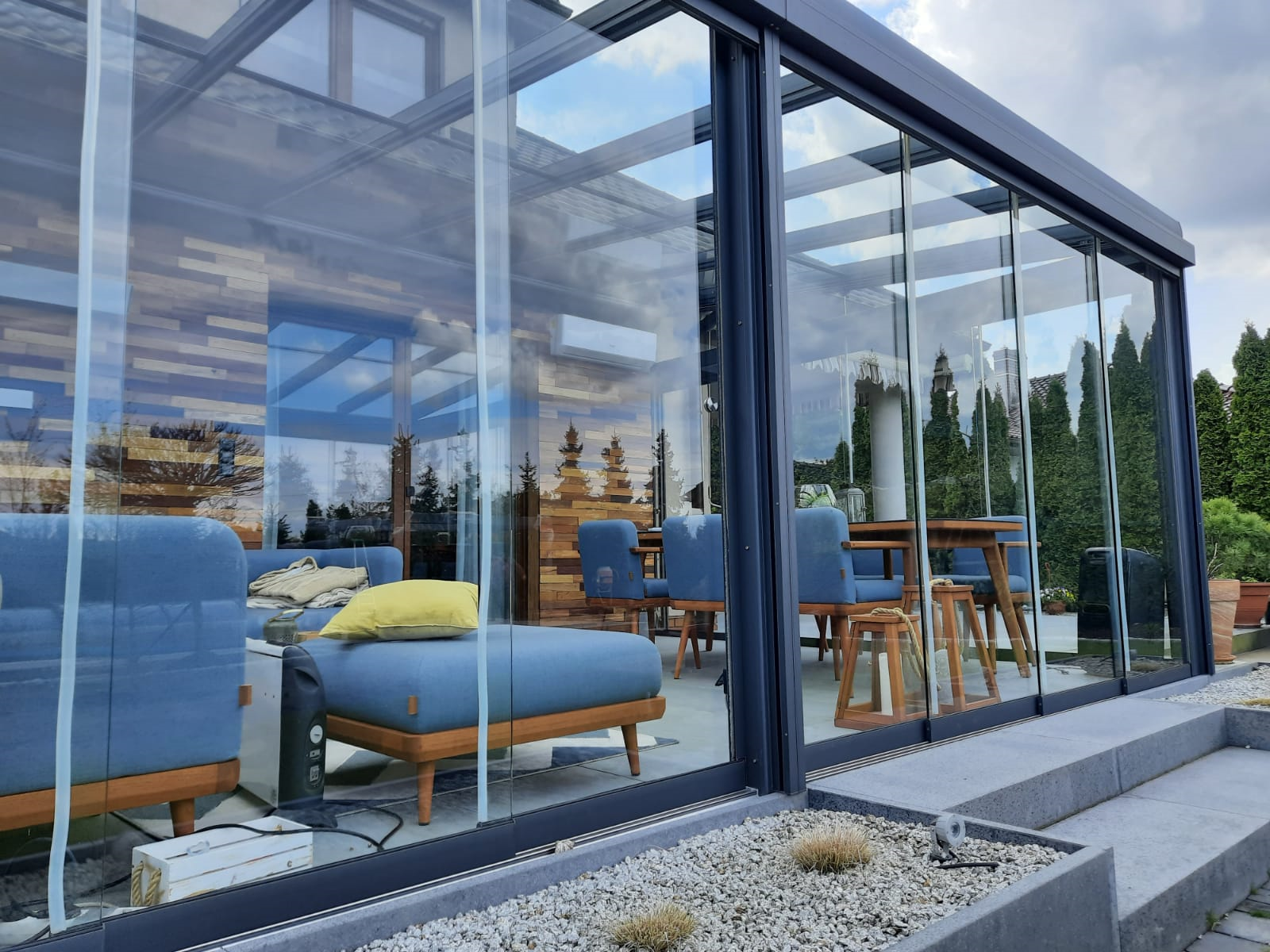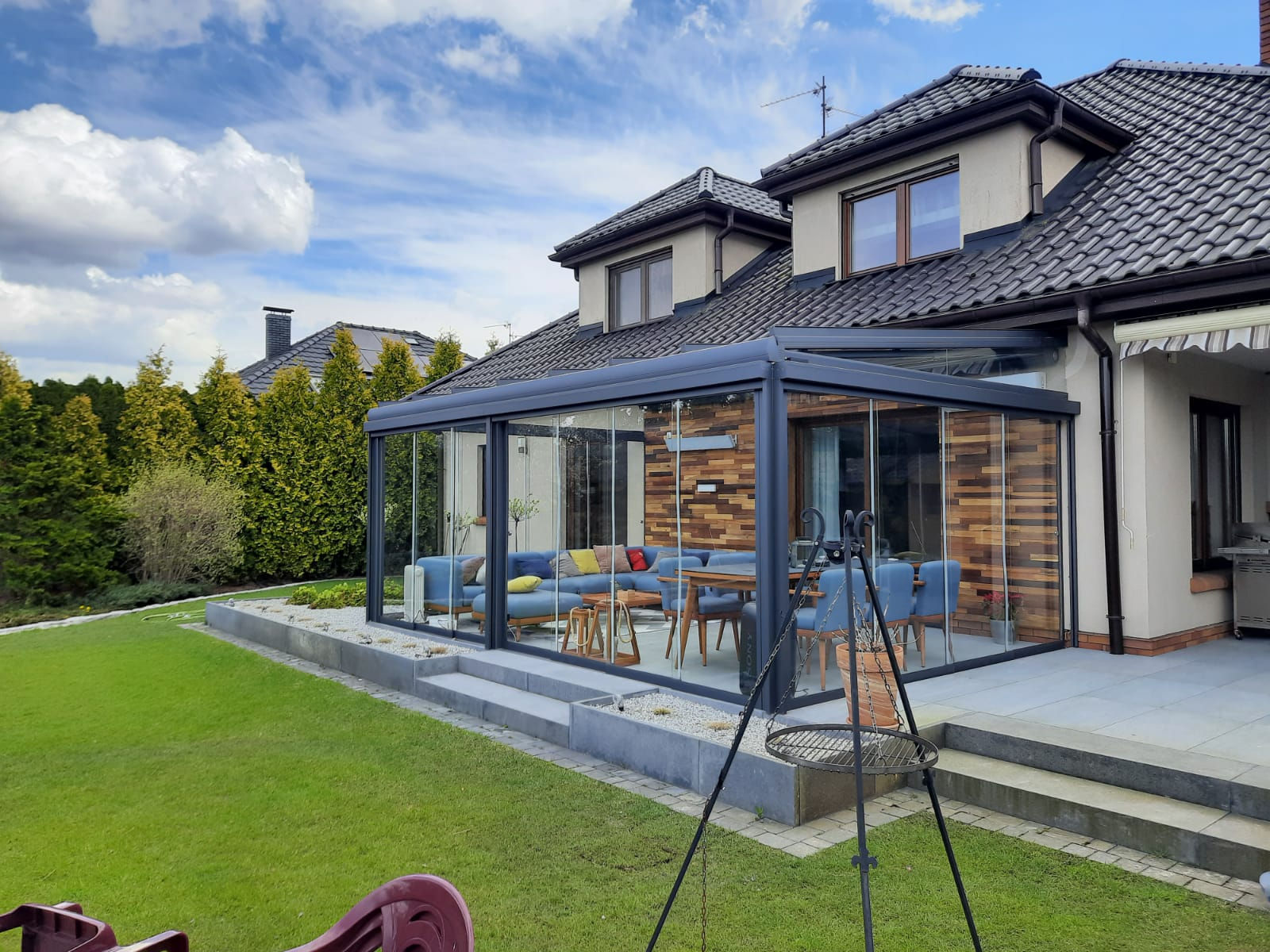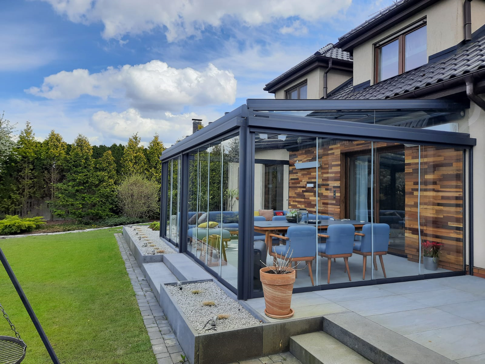 Prezentowana pergola to dach szklany niemieckiego producenta firmy Lewens, która wykonana jest w sporych wymiarach gabarytowych jako wersja przyścienna wraz z trzema słupami frontowymi. Po obwodzie pergoli zamontowane są szyby bezramowe z możliwością ich rozsuwania oraz refleksole w systemie zip montowane od czoła pergoli jako osłona zarówno przeciwsłoneczna jak i wiatrowa. Ponadto pod dachem pergoli zamontowana została markiza gwarantująca ochronę termiczną przed nadmiernym słońcem. Elementem dodającym uroku pergoli jest oświetlenie LED w krokwiach pergoli w postaci taśmy LED, które tworzy ujmujący i klimatyczny nastrój oraz dodaje dodatkowy walor estetyczny. Zwieńczeniem całej wykonanej przez nas realizacji są meble polskiej firmy RONDO wykonane z drewna robinii akacjowej. Zestaw jadalniany i wypoczynkowy wykonany w tej samej kolekcji oraz w tych samych nowoczesnych i wysokiej jakości tkaninach Sunbrella Natte tworzy spójną całość.