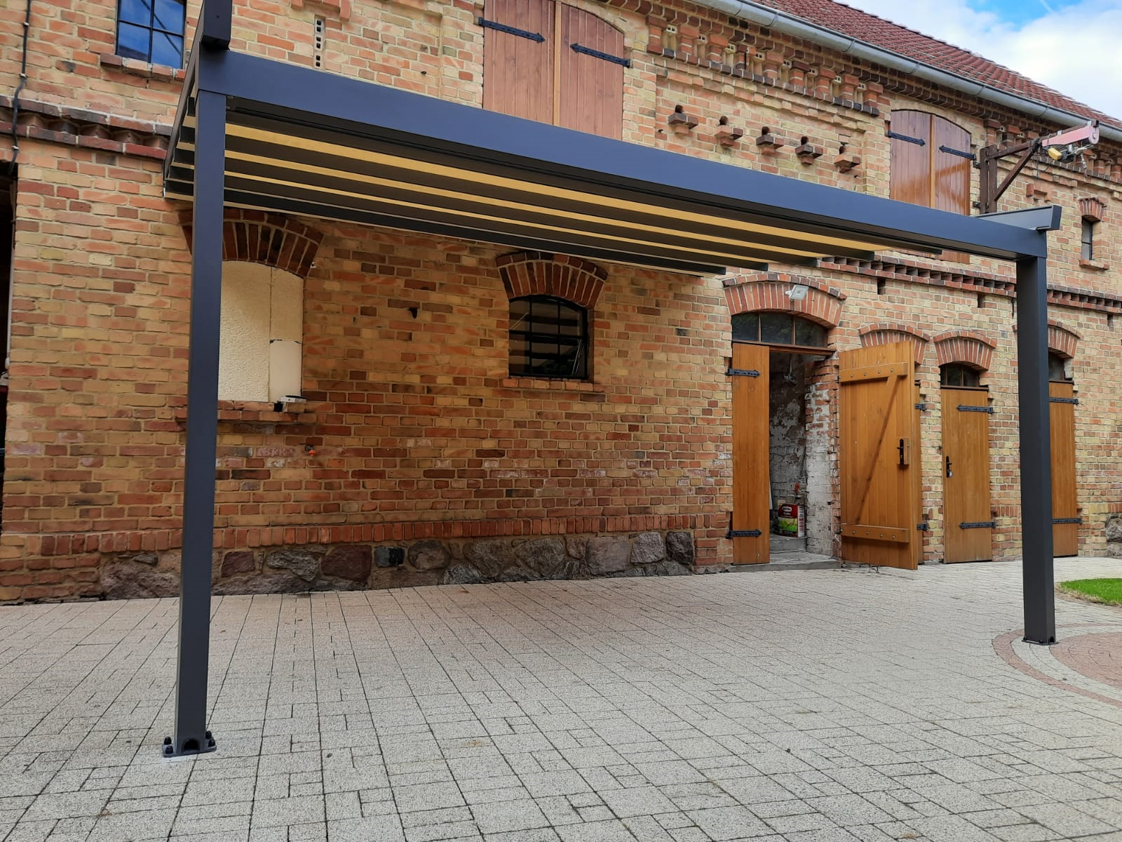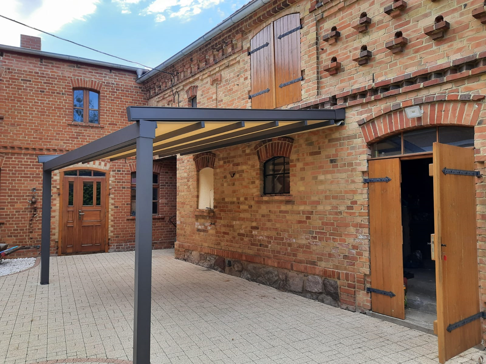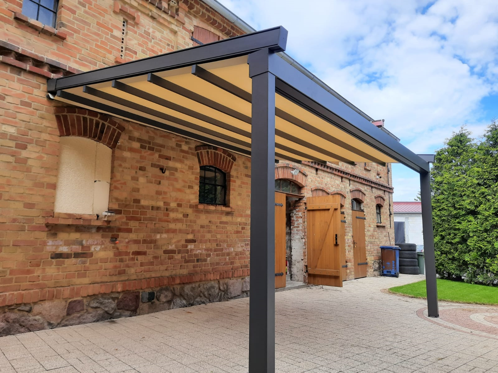 Tym razem w roli głównej przedstawiamy pergolę materiałową typu Square, która wykonana jest w wersji przyściennej na dwóch skrajnych frontowych podporach w dość standardowym wymiarze 450 cm x 320 cm. Nowoczesna pergola materiałowa została zamontowana na starodawnej ale pięknie wykonanej fasadzie budynku, która naszym zdaniem idealnie komponuje się z zamontowaną przez nas konstrukcją. Nowoczesna forma zabudowy tarasu oraz dobrana kolorystyka przez naszego klienta wpisuje się w otaczający klimat. Pergola dzięki swoim właściwościom spełnia funkcję zarówno przeciwsłoneczną - chroni przed nadmiernym nagrzewaniem się wnętrza tarasu, jak i funkcję przeciwdeszczową - zastosowana tkanina w pełni chroni przed intenstywnymi opadami deszczu. Zintegrowany system odprowadzenia wody opadowej w rynnie oraz rozwijanie i zwijanie dachu materiałowego za pomocą silnika radiowego tworzy zadaszenie pod każdym względem funkcjonalne.