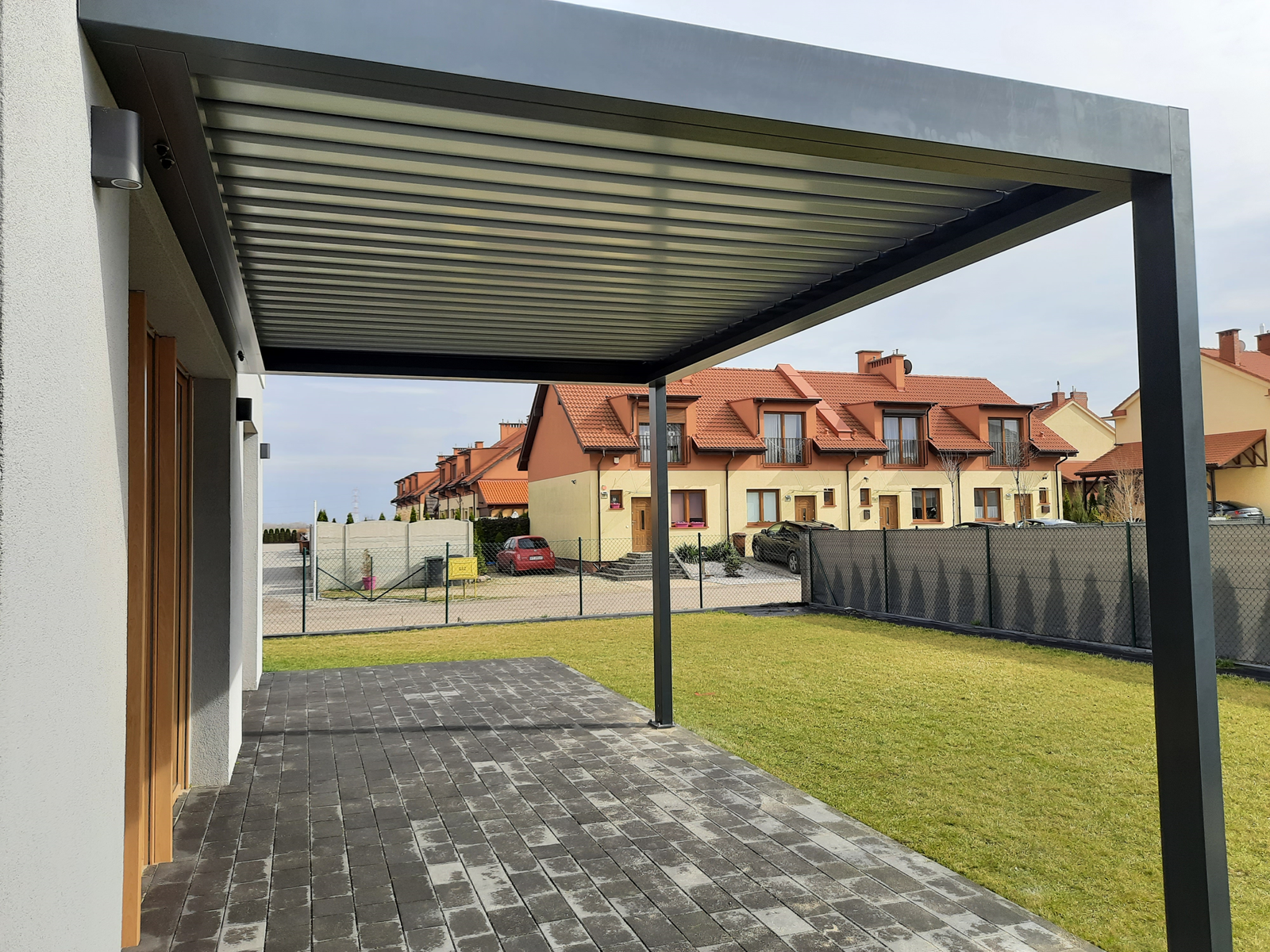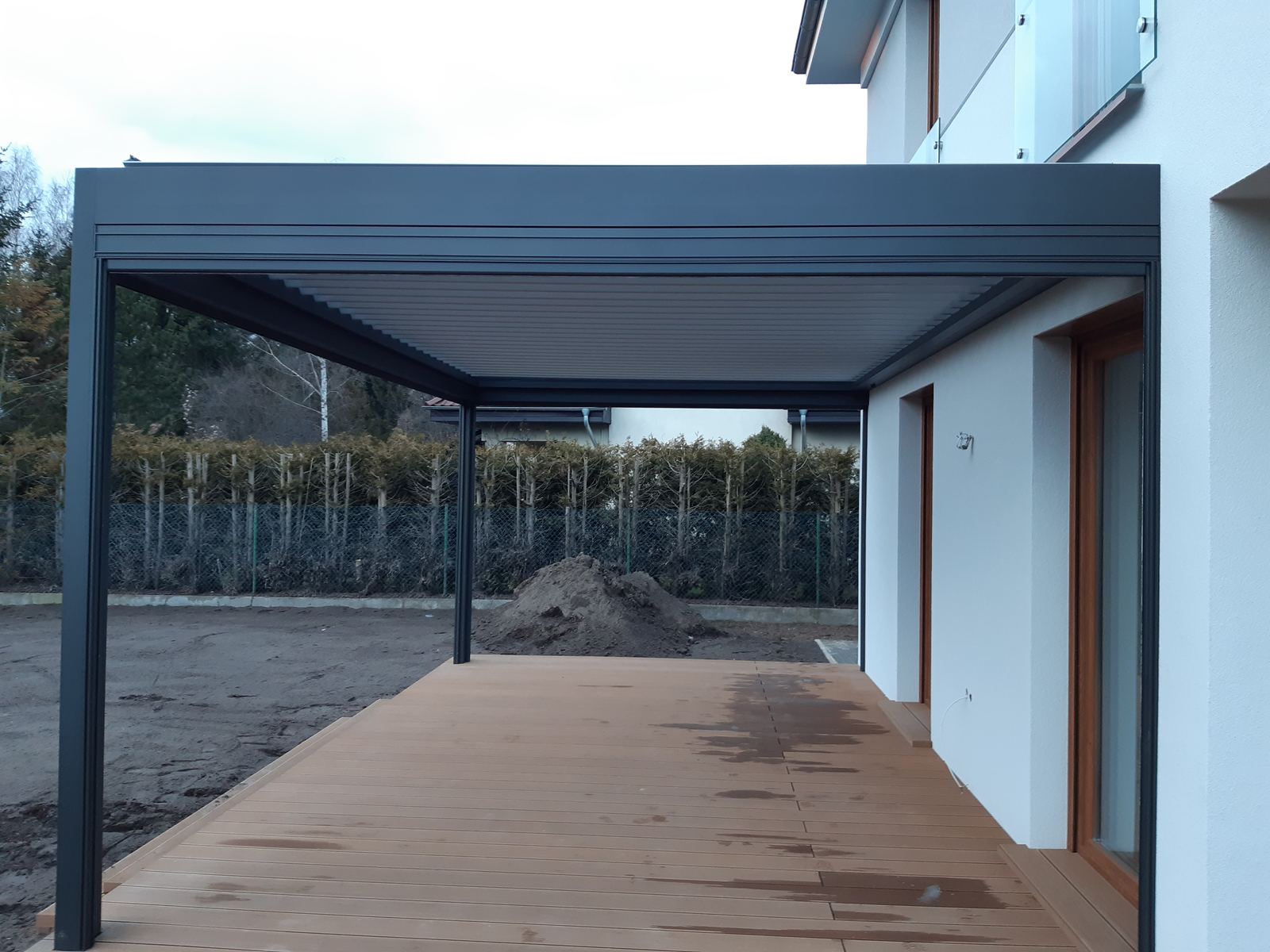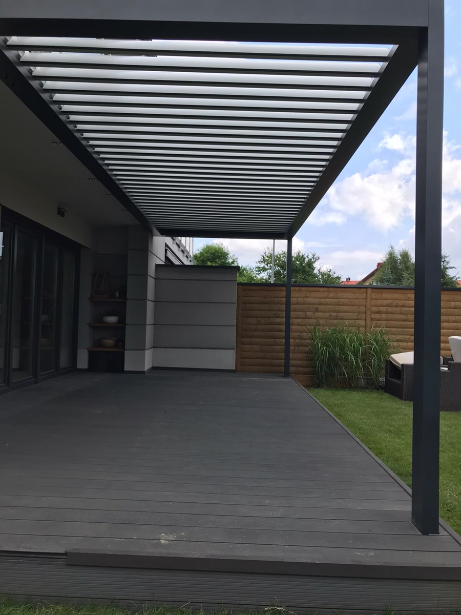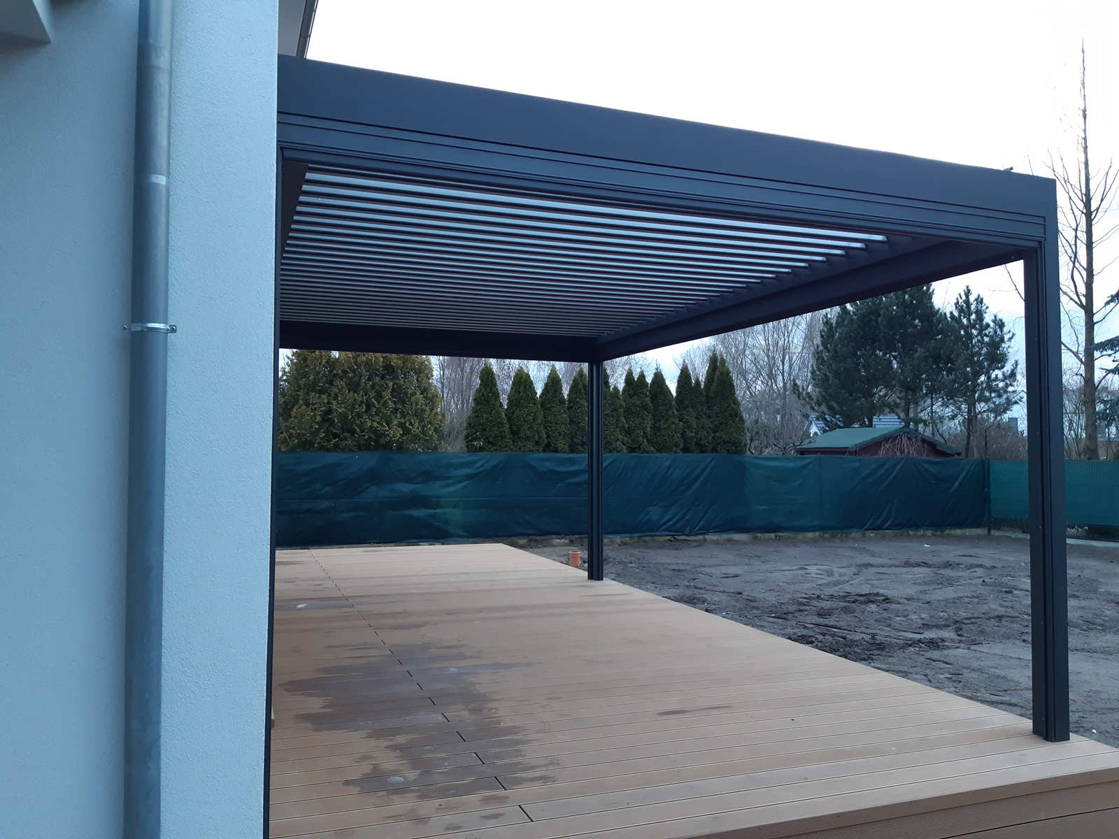 Pergola lamelowa wykonana jest w całości z aluminium. Na dachu posiada obracane lamele w zakresie kąta 0-90 stopni, dzięki którym swobodnie regulujemy dostęp słońca do wnętrza pergoli a także uzyskujemy naturalną cyrkulację powietrza. Lamele w systemie zamkniętym są całkowicie szczelne nawet przy największych opadach deszczu.