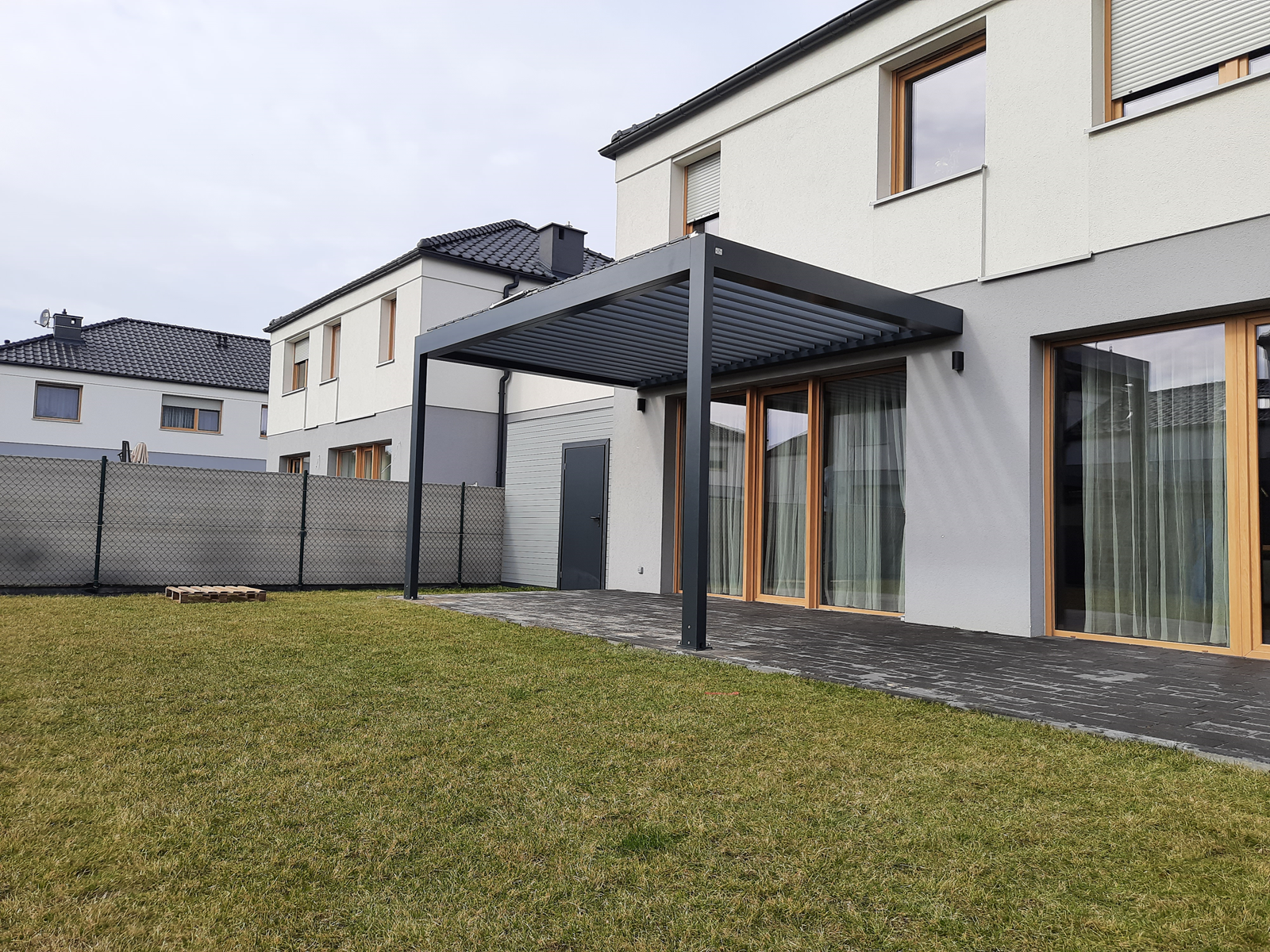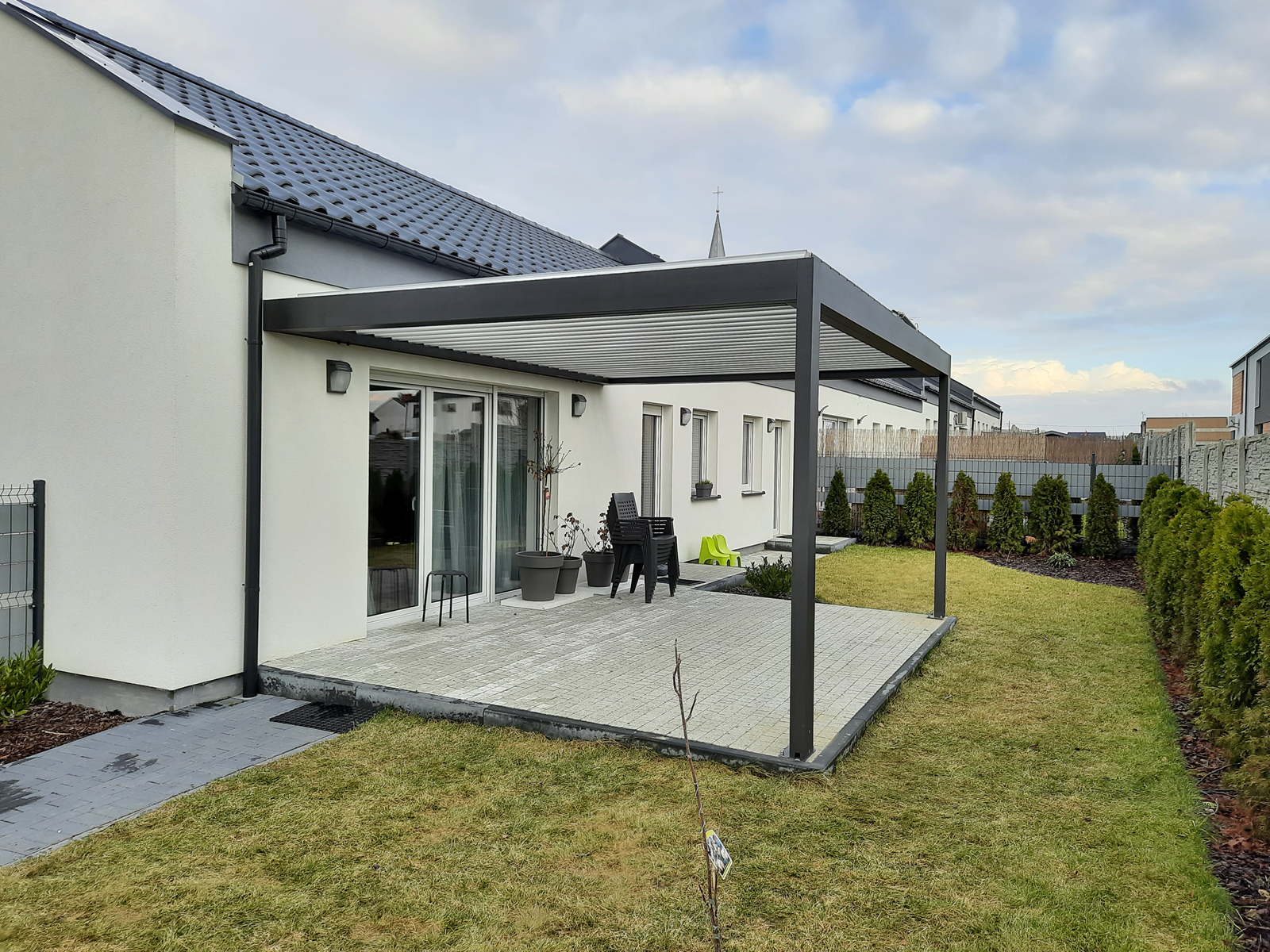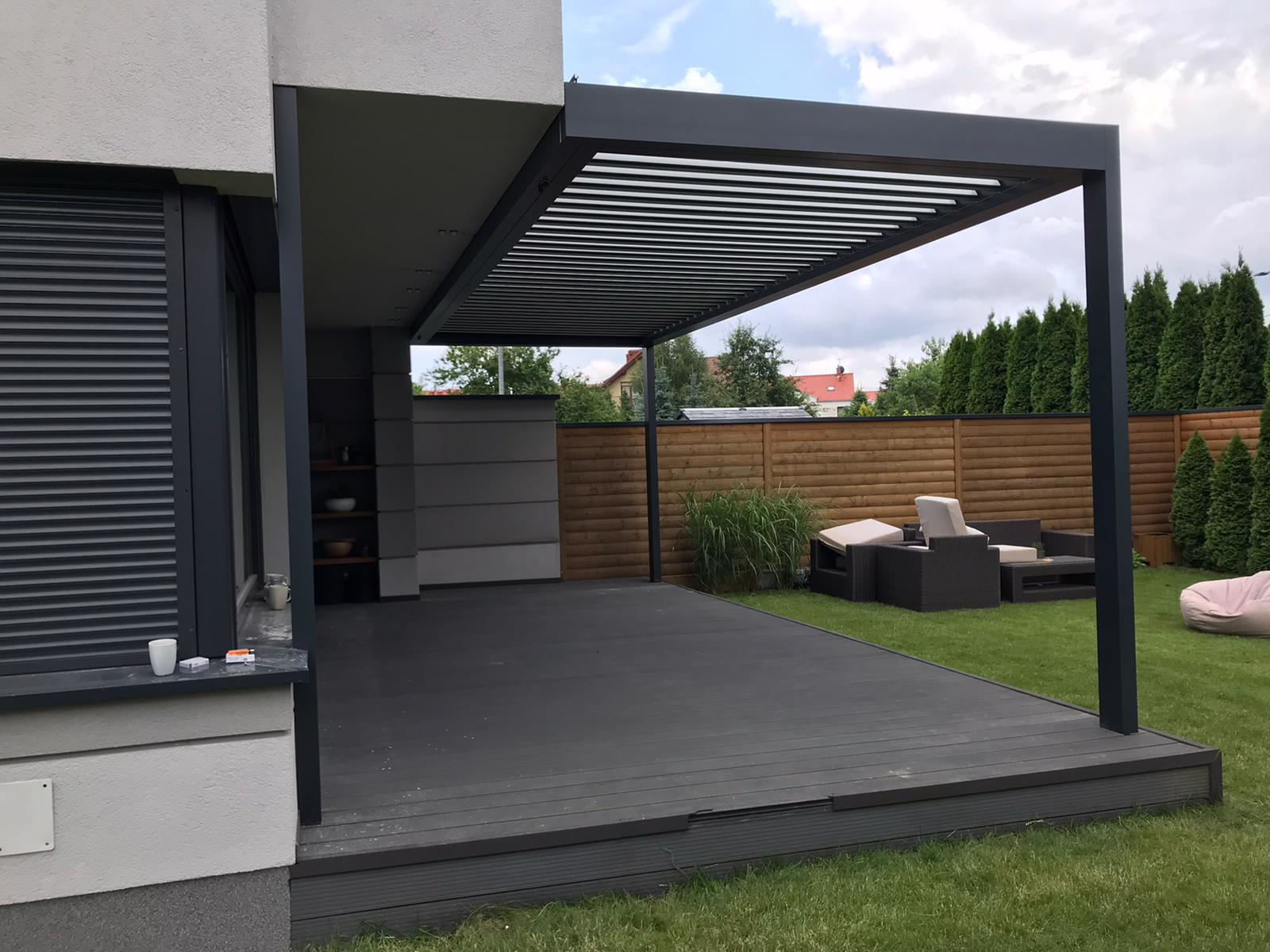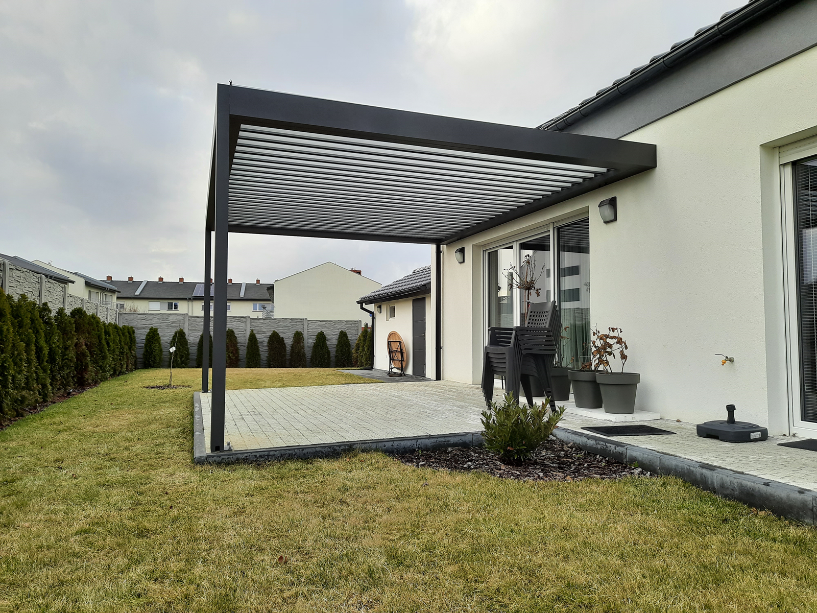 Pergola lamelowa wykonana jest w całości z aluminium. Na dachu posiada obracane lamele w zakresie kąta 0-90 stopni, dzięki którym swobodnie regulujemy dostęp słońca do wnętrza pergoli a także uzyskujemy naturalną cyrkulację powietrza. Lamele w systemie zamkniętym są całkowicie szczelne nawet przy największych opadach deszczu.