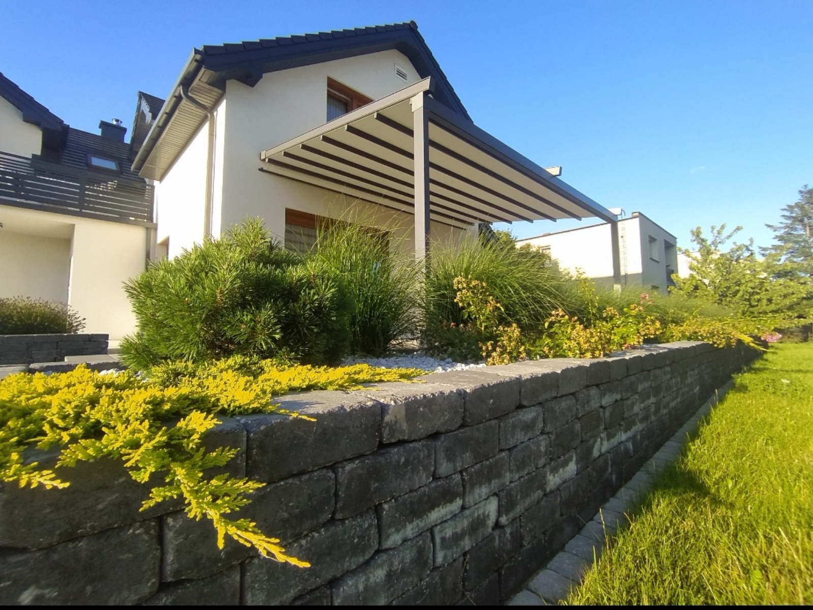 Prezentowana pergola na poniższych zdjęciach wykonana jest w wymiarze 600 cm x 400 cm w wersji przyściennej - montowanej do ściany - wówczas pergola posiada dwie skrajne podpory z przodu ale 3 prowadnice dachowe wzmacniające konstrukcję pergoli. Zwieńczeniem całego zadaszenia jest dodatkowe oświetlenie w postaci punktów LED usytuowanych w belkach przeciwwwietrznych. Całe oświetlenie sterowane jest za pomocą pilota z możliwością regulacji natężenia światła.