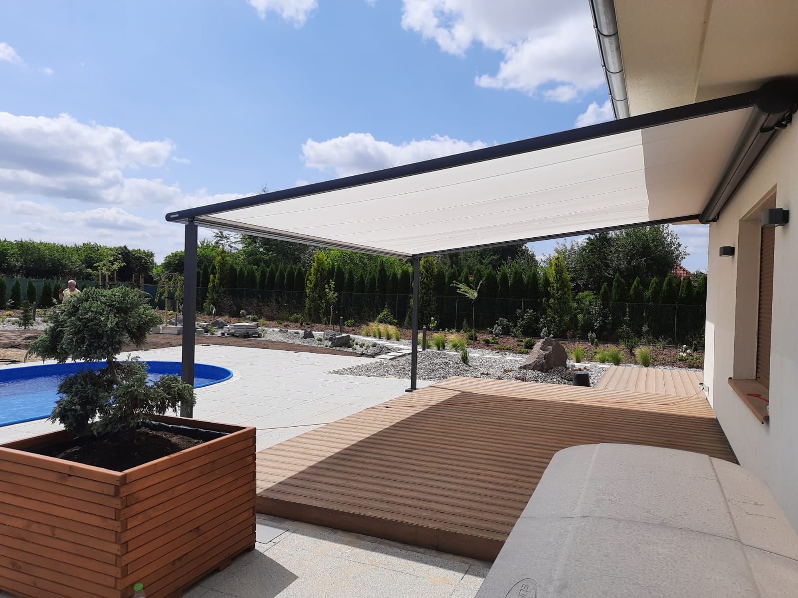 Na poniższym zdjęciu mogą Państwo zobaczyć naszą ostatnią realizację. Warto zwrócić uwagę na odpowiedni wybór kolorystyczny całego zadaszenia - antracytowy kolor konstrukcji współgra z elementami dekoracyjnymi ogrodu oraz panelami fotowoltaicznymi na dachu domu a jasna, beżowa tkanina nawiązująca do elewacji domu bardzo dobrze odbija promienie słoneczne.