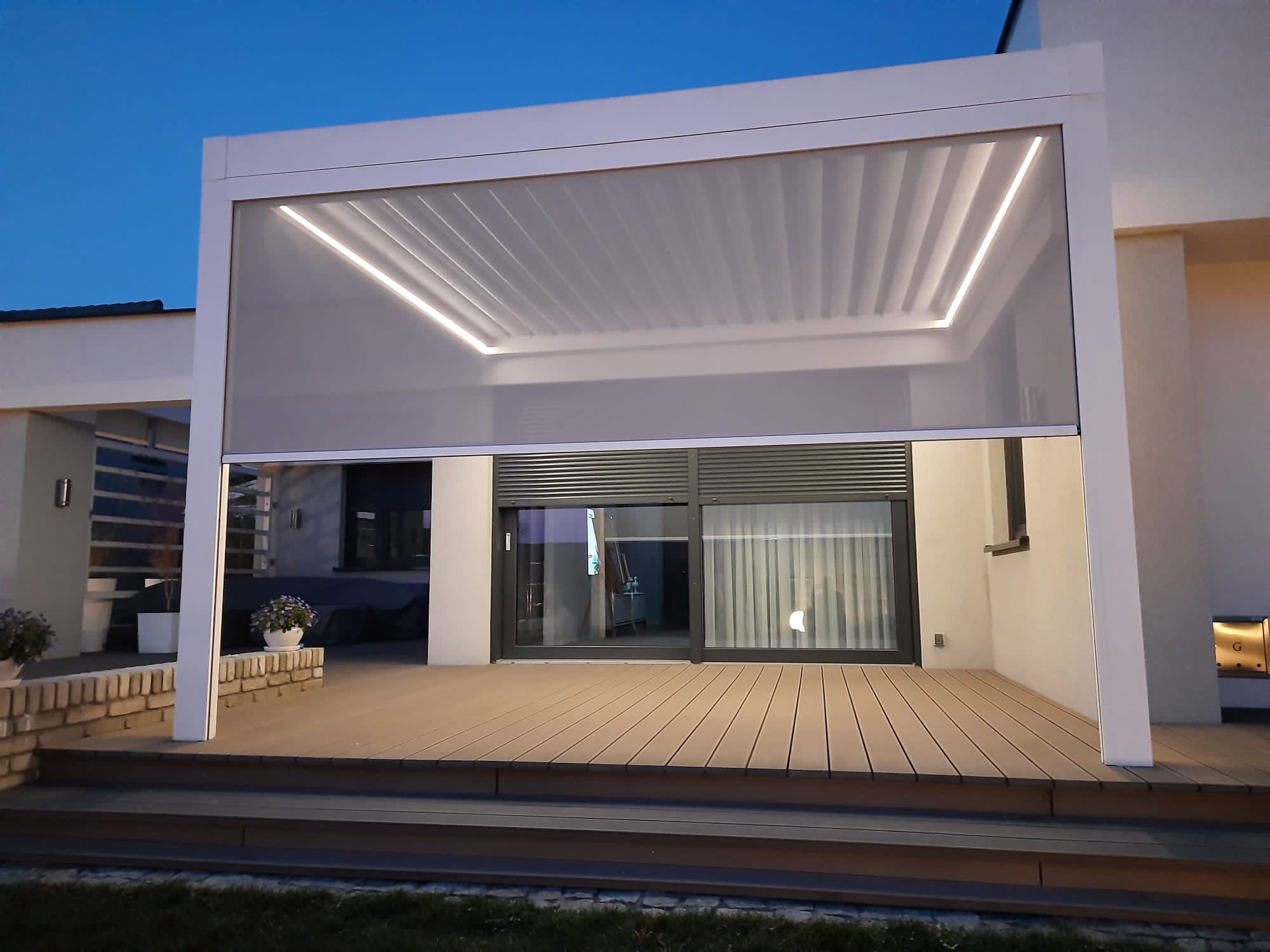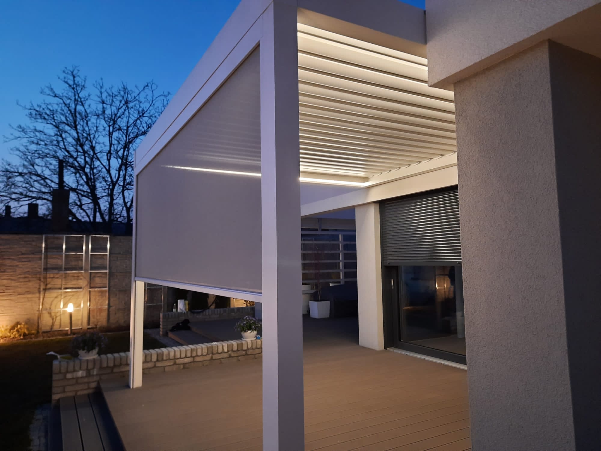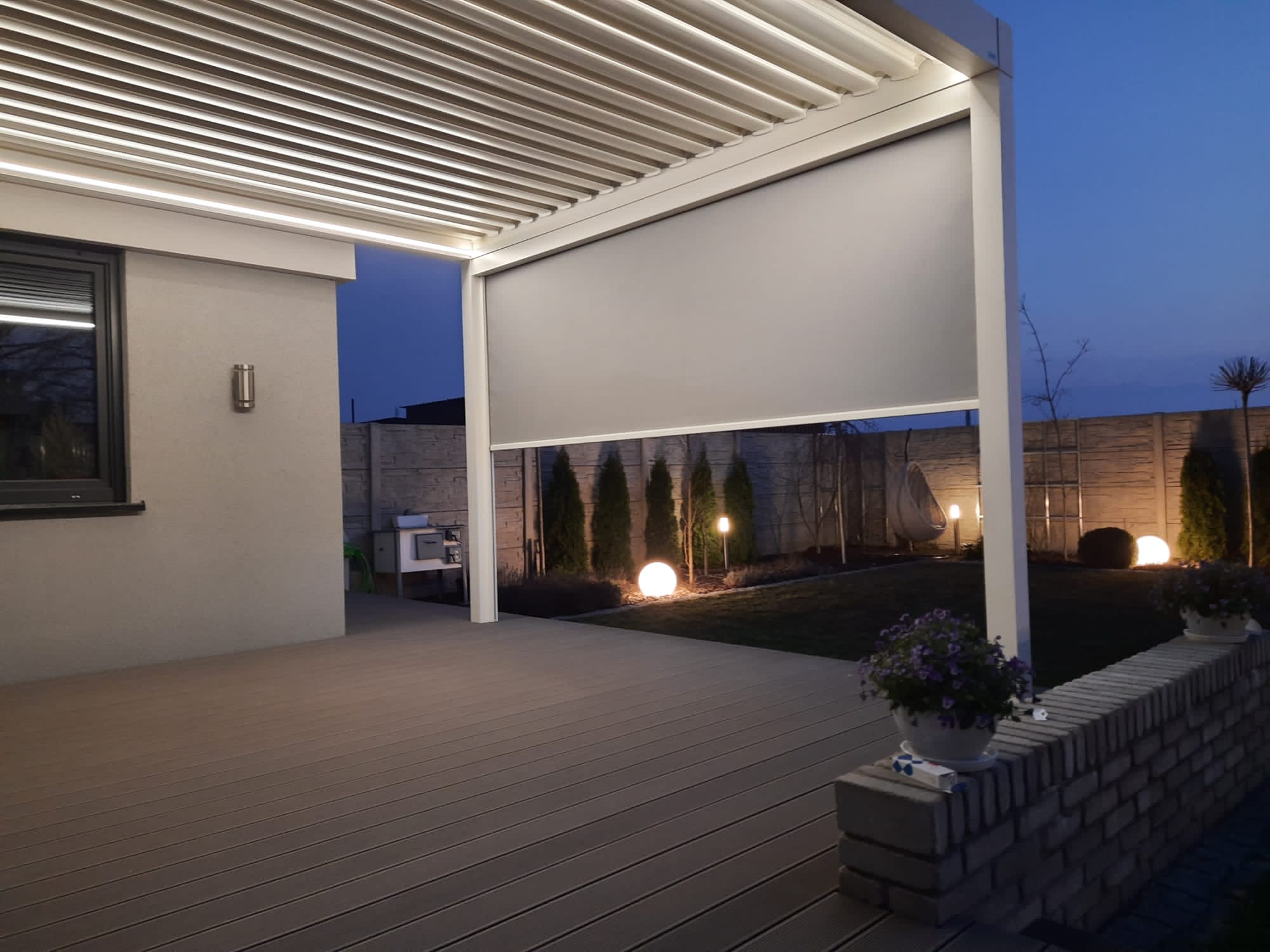 Zaprezentowana pergola u naszego klienta wykonana jest w wersji przyściennej na dwóch skrajnych frontowych nogach. Między nimi zamontowana jest przednia roleta pionowa typu screen. Roleta sterowana radiowo za pomocą pilota skutecznie chroni przed zachodzącym słońcem a także nadmiernym wiatrem dzięki wpięciu materiału w prowadnice na zasadzie zamka błyskawicznego tzw. Zip. Zwieńczeniem wykonanej pergoli jest oświetlenie w postaci taśmy LED w górnej ramie pergoli po dwóch przeciwnych stronach.