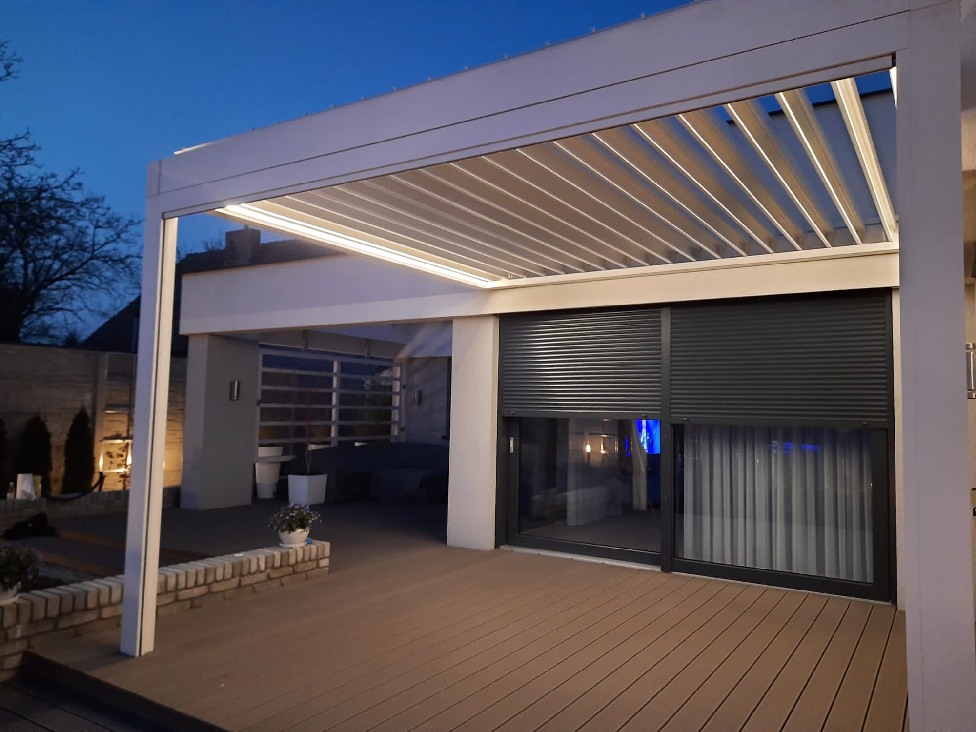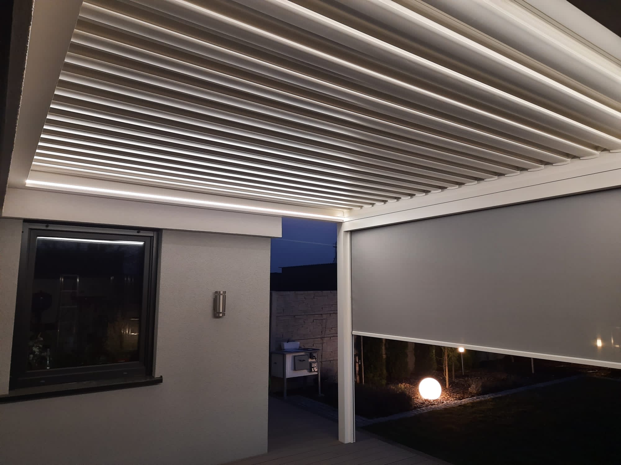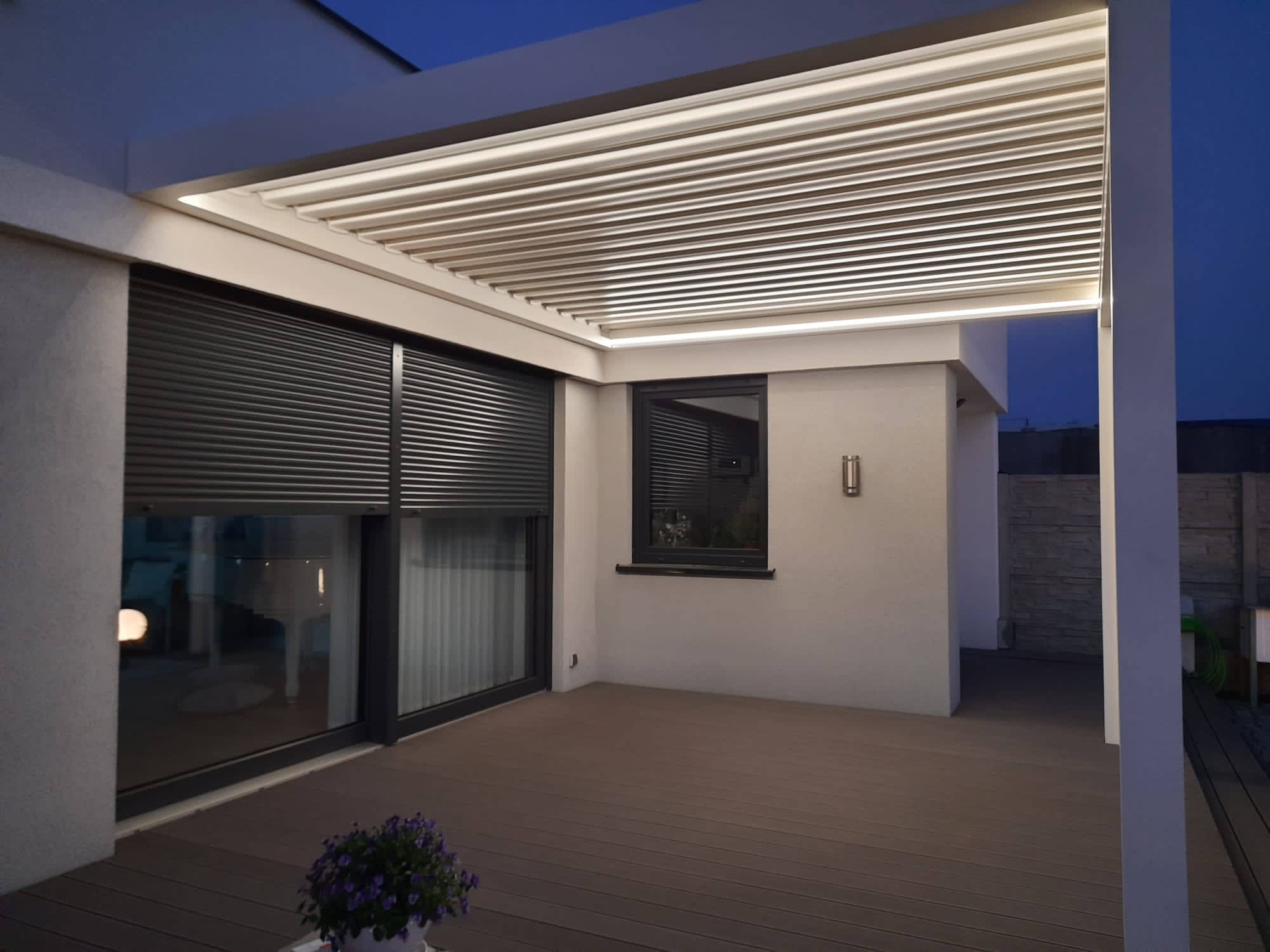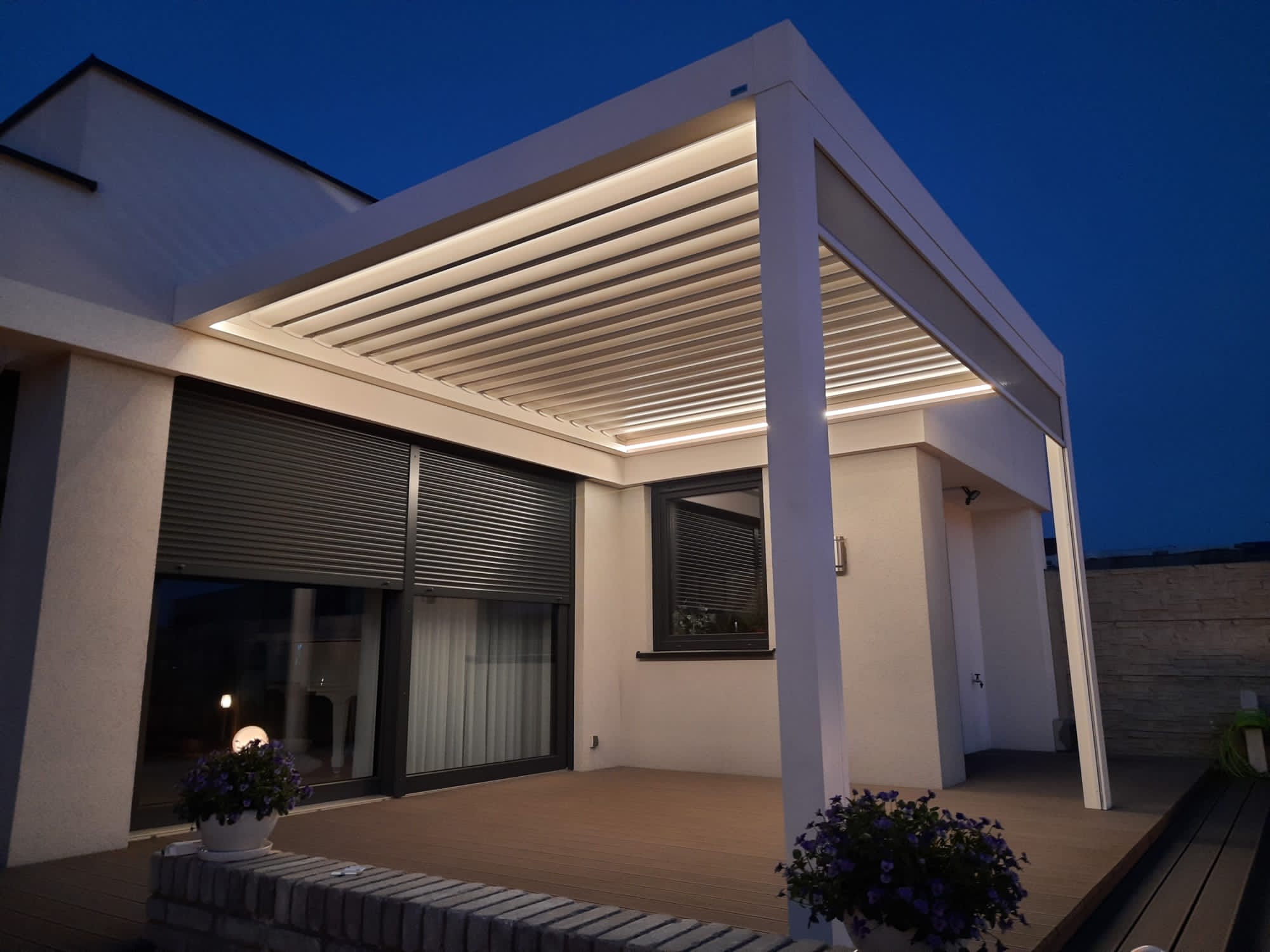 Zaprezentowana pergola u naszego klienta wykonana jest w wersji przyściennej na dwóch skrajnych frontowych nogach. Między nimi zamontowana jest przednia roleta pionowa typu screen. Roleta sterowana radiowo za pomocą pilota skutecznie chroni przed zachodzącym słońcem a także nadmiernym wiatrem dzięki wpięciu materiału w prowadnice na zasadzie zamka błyskawicznego tzw. Zip. Zwieńczeniem wykonanej pergoli jest oświetlenie w postaci taśmy LED w górnej ramie pergoli po dwóch przeciwnych stronach.