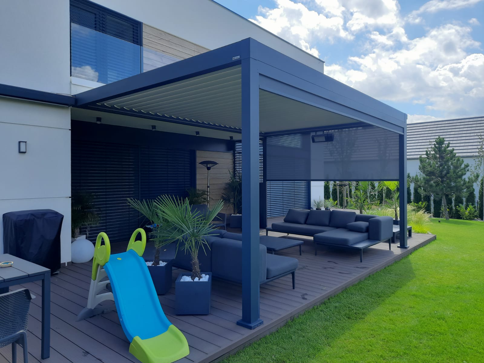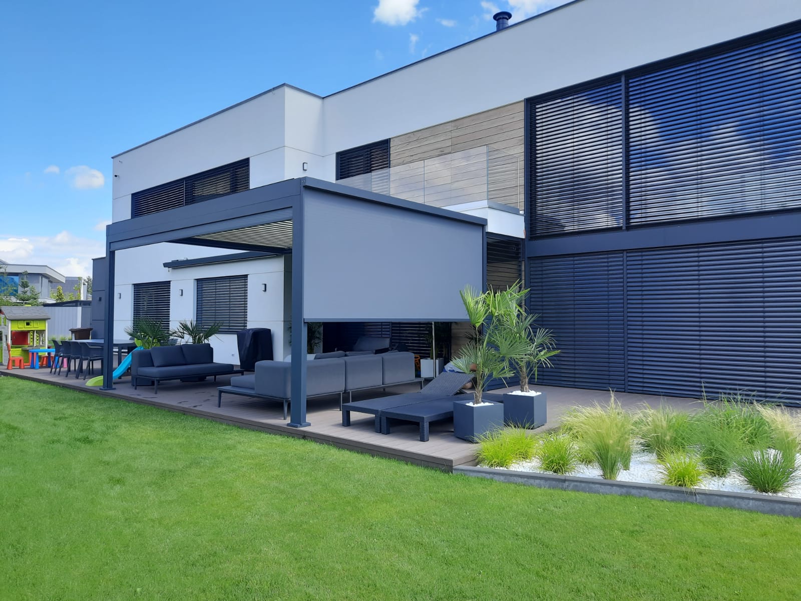 Dzisiejsza realizacja przedstawia klasyczną zabudowę pergoli z obracanym dachem lamelowym w wersji przyściennej. Wykonana pergola w kolorze RAL 7016 ST oraz lamelą w RAL 9010 nawiązuje do wykonanych na oknach żaluzji fasadowych oraz obecnej kolorystyki elewacji domu. Dodatkowym atutem prezentowanej pergoli są rolety pionowe w wersji screen zip, które pełnią funkcję przeciwsłoneczną przed zachodzącym słońcem. Dopełnieniem całej zabudowy jest stały shutters ustawiony między ścianą budynku a roletą zacieniającą.